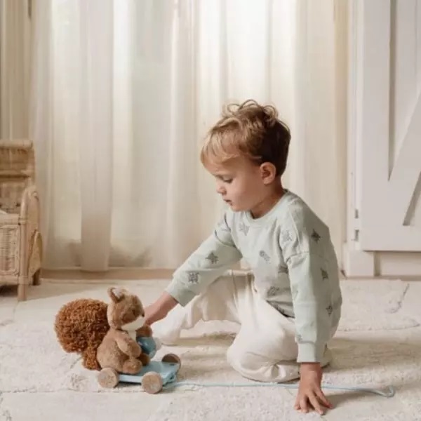 Het zachte knuffel Eekhoorntje staat op een mintgroen houten wagentje en kan los ook gebruikt worden als knuffel om er heerlijk mee te spelen..