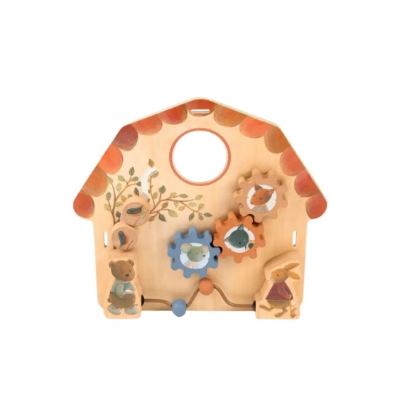 Dit lieve activiteitenbord in zachte kleuren en in de vorm van een huisje stimuleert kleintjes om verschillende activiteiten te ontdekken.