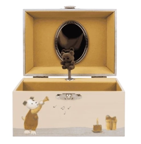 Wanneer je aan de achterkant het muziekdoosje opwindt begint het beertje te draaien voor het spiegeltje.